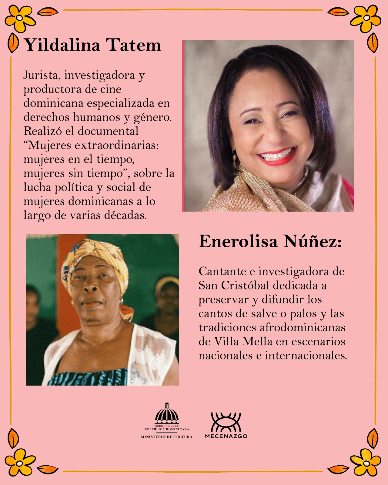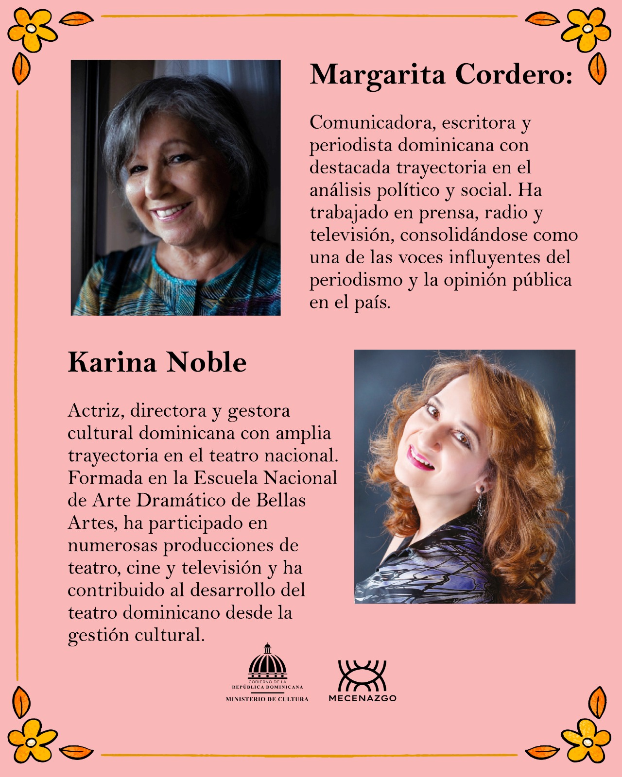 Entre las galardonadas se encuentran Enerolisa Núñez, Karina Noble, Margarita Cordero y Yildalina Tatem, mujeres cuya trayectoria ha contribuido significativamente al fortalecimiento del arte, la cultura, la comunicación y la memoria histórica de la República Dominicana.